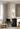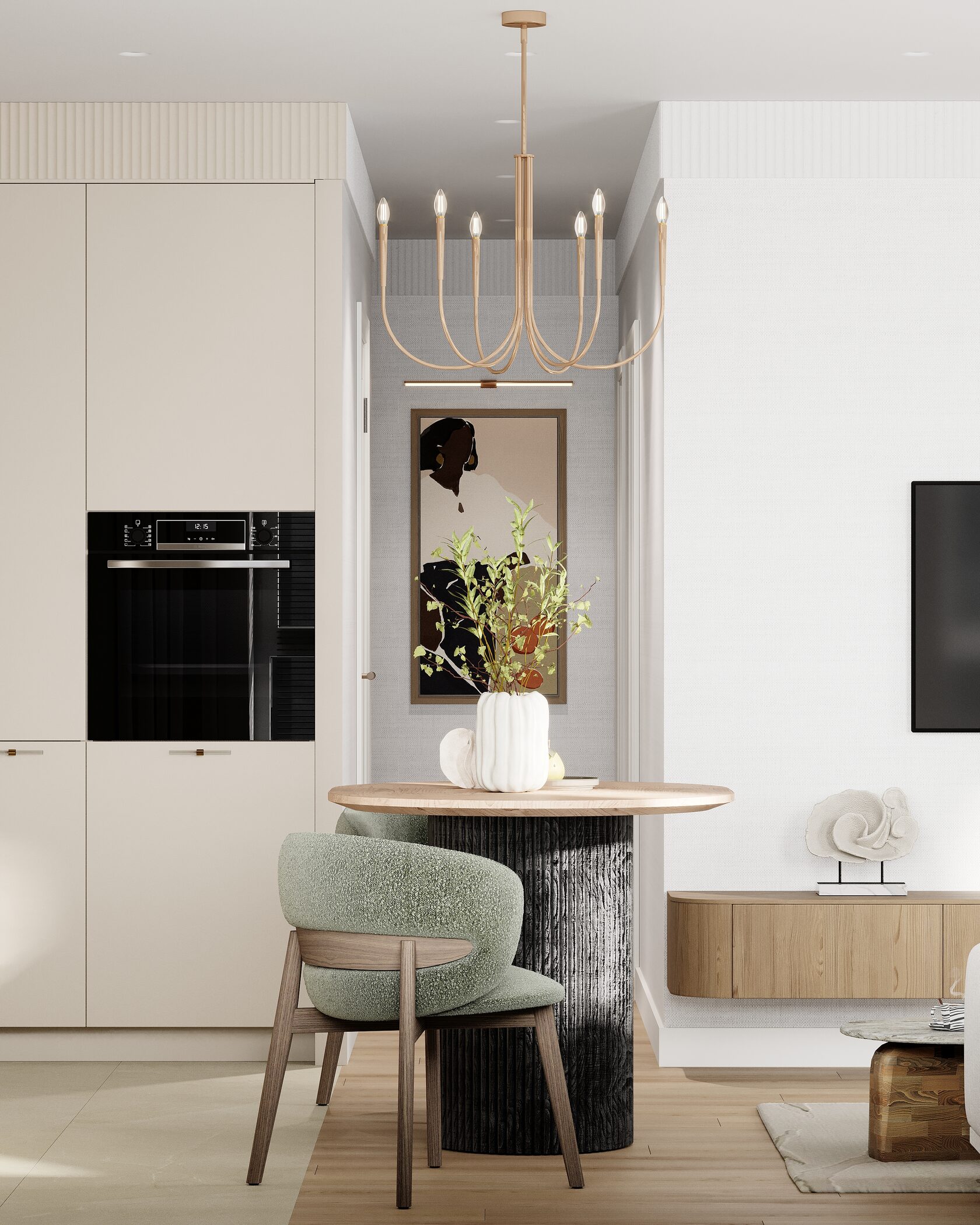 Стильно обставленная зона гостиной с двумя окнами и переходом в зону кухни. Преобладают бежевые и серые тона. Дополняют золотые оттенки и с яркий, тёмно-бордовый элемент.